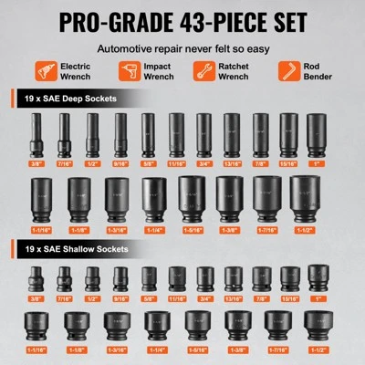 Abundant Components: This comprehensive set includes 19pcs SAE deep sockets and 19pcs SAE shallow sockets: 3/8″, 7/16″, 1/2″, 9/16″, 5/8″, 11/16″, 3/4″, 13/16″, 7/8″, 15/16″, 1″, 1-1/16″, 1-1/8″, 1-3/16″, 1-1/4″, 1-5/16″, 1-3/8″, 1-7/16″, 1-1/2″. It also includes 4 extension bars (3″, 5″, 10″, 15″) and a universal joint.