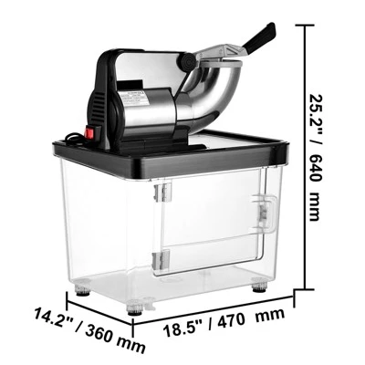 Integrated PC Storage Box: An extra-large PC storage box is integrated into our electric shaved ice machine, adopting the technique of one-piece injection moulding. It measures 18.5″ (47 cm) long, 14.2″ (36 cm) wide, 14.2″ (36 cm) deep, and 0.2″ (4 mm) thick, which is capable of holding around 9 Gal (34 L) of shaved snow ice. The thick case wall can keep the crushed ice inside frozen for longer, and the snow-ice won’t splash everywhere for secure operation concerns.