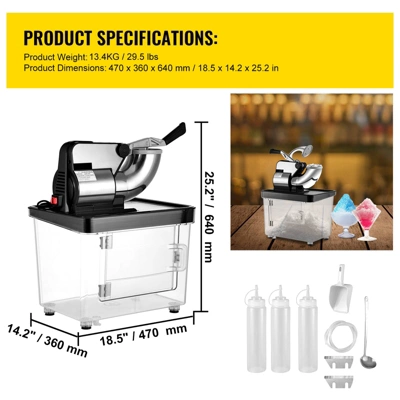 Details for Comfortable Use: Thoughtful designs for improving your user experience are also combined on our snow cone maker. The non-slip handle is ergonomically designed for labor-saving operation. With the water outlet below, you can discharge the melted ice timely. The rubber feet at the bottom can stabilize the machine. The limit switch serves to enhance security. And waterproof on/off control minimizes the restriction on operating when your hands are wet.