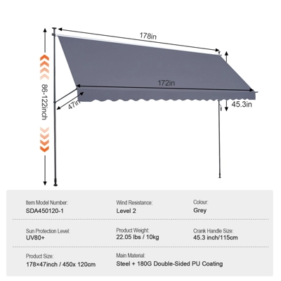 Sunshade and Waterproof: Are you still struggling with the summer heat? This large 178 x 47 in retractable patio awning features a 180g waterproof lock-color PU coating, providing UV protection rated at UV80+, making it the ideal awning for patio relaxation.