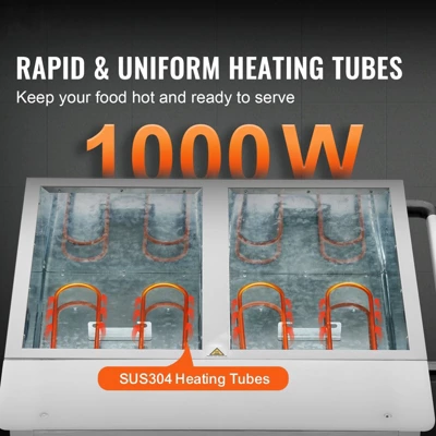 Fast Heating, Lasting Warmth: Keep your dishes warm and ready to serve with VEVOR 1000W commercial electric food warmer! Featuring independent knob switch and 304 stainless steel heating tubes in each well, our steam table delivers powerful heating for uniform and rapid heat transfer, preserving the hot and delicious flavors of your food for longer.