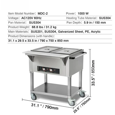 Multi-Purpose Food Warmer: Featuring a PE processing table, our 2-pot steam table provides additional workspace for convenient food preparation, cutting, and more. Furthermore, its durable bottom shelf offers ample storage for utensils, food pans, ingredients, and seasonings, keeping everything you need within reach.