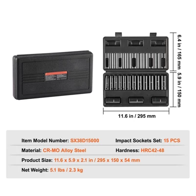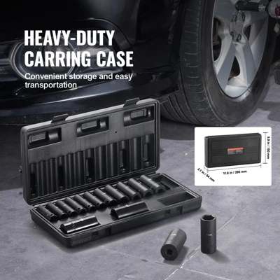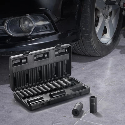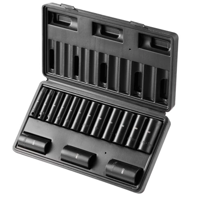 - Includes 15 deep sockets with a portable plastic toolbox.