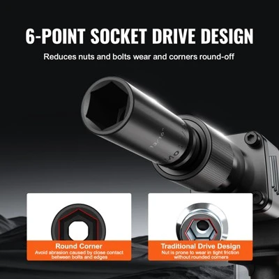 High Torque: Distinguished by its hexagonal drive design, which sets it apart from traditional designs lacking rounded corners, this socket tool set significantly reduces pressure exerted on fasteners during impact. As a result, it minimizes wear and effectively prevents bolt rounding and stripping.