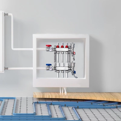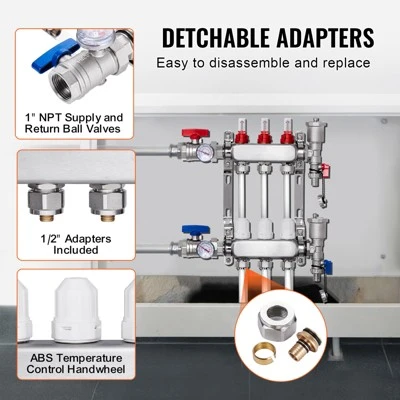 Product Parameters: This radiant heat manifold features 3 branches, 1-inch NPT supply and return ball valves, and supports a flow rate of up to 5L/min. It includes 1/2-inch adapters and 2 temperature gauges (display both Fahrenheit and Celsius), making it an ideal choice for efficient radiant floor heating systems.