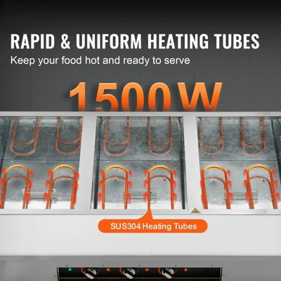 Fast Heating, Lasting Warmth: Keep your dishes warm and ready to serve with VEVOR 1500W commercial electric food warmer! Featuring independent knob switch and 304 stainless steel heating tubes in each well, our steam table delivers powerful heating for uniform and rapid heat transfer, preserving the hot and delicious flavors of your food for longer.