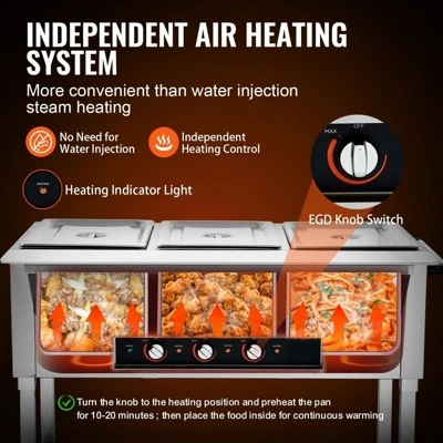 Independent Heating System: One knob switch controls one food pan. You can set the temperature independently for each pan to ensure optimal freshness and flavor. Our food warming table operates without the need for water, using air heat transfer for safe and convenient heating. Preheat for 10-20 minutes before heating delicious food. (This steam table is intended only for dry use).