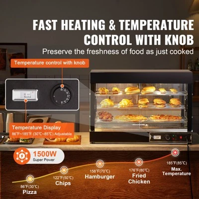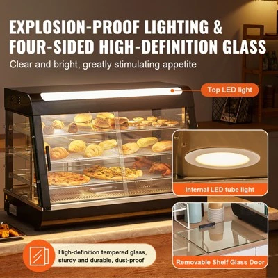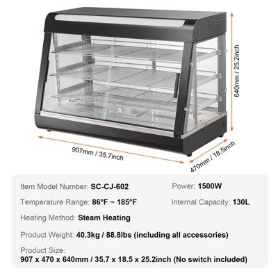 3-Tier Large Space: Dimensions: 35.71 x 18.50 x 25.20 inch / 907 x 470 x 640 mm. Our countertop food display case features 3 spacious food-grade shelves, allowing you to place different sizes of food freely. It is ideal for holding and storing pizza, egg tarts, fried chicken, or burgers, ensuring the food stays fresh for a long time.