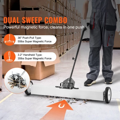 Superior Magnetic Power: The VEVOR magnetic sweeper with wheels includes a 36” magnetic sweeper with wheels and a 3.2” telescoping magnetic pickup tool, capable of holding up to 55 lbs (36”) and 35 lbs (3.2”) respectively. It effortlessly collects nails, screws, and black metal debris, protecting you from shards and sharp metals.