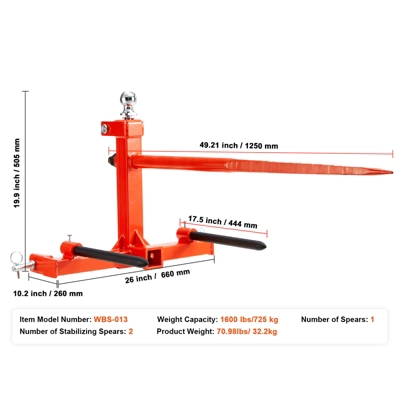 Universal Compatibility: Our hay bale spear is compatible with 3-point hitch tractors. Its precise measurements ensure a hassle-free fit, eliminating compatibility concerns. The hitch ball diameter is 2-5/16″, providing greater compatibility.