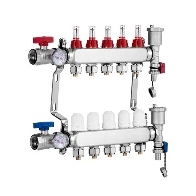 Product Parameters: This radiant heat manifold features 5 branches, 1-inch NPT supply and return ball valves, and supports a flow rate of up to 5L/min. It includes 1/2-inch adapters and 2 temperature gauges (display both Fahrenheit and Celsius), making it an ideal choice for efficient radiant floor heating systems.