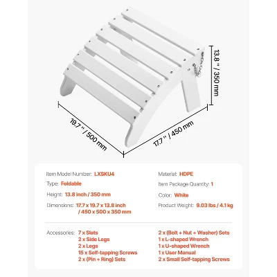 Easy Assembly: Just 4 steps—open the chain bolts, insert screws, tighten, and secure the Adirondack foot stool. Quick to assemble, saving you time and effort. Clean with soap and water, and use a soft brush or sandpaper sponge to buff out scratches.