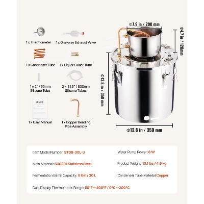 8 Gal Distiller Kit: We provide a complete kit for this distiller, comprising a fermentation barrel, barrel lid, and cooling pot. The kit is made from food-grade materials including stainless steel, silicone, and copper, ensuring direct contact with ingredients. There are 3Gal, 5Gal, 8Gal, and 13.2Gal capacity fermentation barrels to choose from, perfect for gatherings with friends and family.