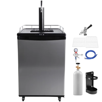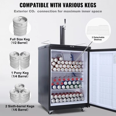 Spacious and Reliable: We offer an external bracket for the CO₂ tank, which helps save space inside the kegerator. The kegerator itself is spacious enough to accommodate beer barrels of varying sizes, including US-standard full-size, quarter, and sixth barrels. Plus, there are two additional shelves provided, which allow you to use the kegerator as a refrigerator as well.