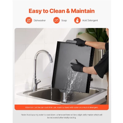Quality Carbon Steel: Made of carbon steel with a BPA-free PTFE coating on the surface, this griddle can handle temperatures up to 500℉. Do not dry heat and rinse when hot. The bottom x-shaped reinforcement resists to deform