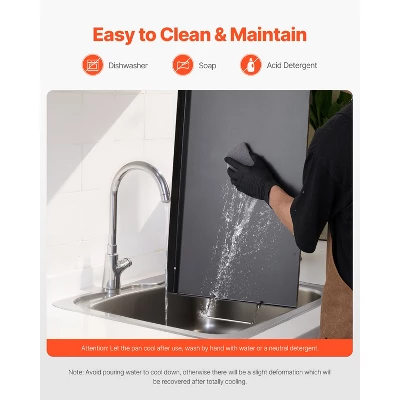 Quality Carbon Steel: Made of carbon steel with a BPA-free PTFE coating on the surface, this griddle can handle temperatures up to 500℉. Do not dry heat and rinse when hot. The bottom x-shaped reinforcement resists to deform