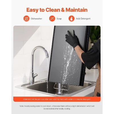 Quality Carbon Steel: Made of carbon steel with a BPA-free PTFE coating on the surface, this griddle can handle temperatures up to 500℉. Do not dry heat and rinse when hot. The bottom x-shaped reinforcement resists to deform