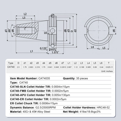 - High-performance CAT40 collet holders and ER spring collet chucks designed for exceptional balance and long service life.