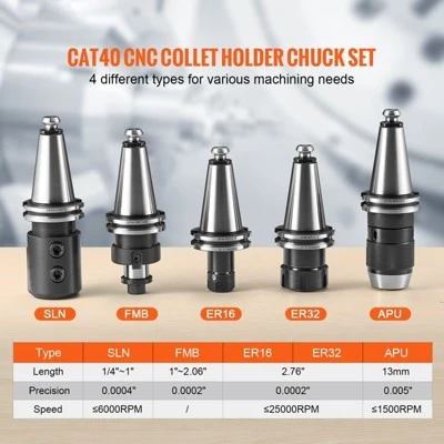 Spring Steel Design: Elevate your machining with our high-performance CAT40 collet holder and ER spring collet chucks, offering exceptional balance and a long service life. Includes 6 x CAT40 SLN collet holders with sizes: 1/4″, 3/8″, 1/2″, 5/8″, 3/4″, 1″; ER32 and ER16 dynamic balance collet holders have a prominent length of 2.76”; APU collet holder with an extension length of 13 mm and a 1″-2.06″ FMB collet holder.