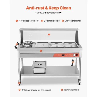 Thoughtful Details: The removable sneeze guard allows customers to select food with security and reliability. The large undershelf is perfect for storing extra tableware and utensils. With a 1.8m power cord and main power switch design, it eliminates distance limitations to outlets. Widely used in cafeterias, hotels, fast food restaurants, supermarkets, and more