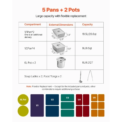 Commercial-Grade Large Capacity: One full-size pans, four 1/2-size pans, and two 6L pots, our steam table is designed for flexible replacement and customized layout to meet a variety of dining needs. Our standardized machine dimensions are compatible with all pans up to 5.9 inch in depth