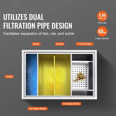 High Efficiency: This commercial grease trap features a dual path filtration pipe design, significantly enhancing its filtering efficiency. With a high flow rate of up to 9.96 GPM/min, it ensures continuous wastewater flow and smooth grease capture, preventing grease accumulation in the pipes.