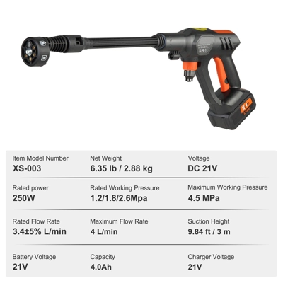 60-Minute Long Battery Life: This cordless power washer includes a 4.0 Ah high-capacity battery andcertified fast charger. Battery life varies between 20/40/60 minutes depending on low/medium/high settings. No need to worry about running out of battery mid-cleaning, experience a new realm of seamless cleaning.