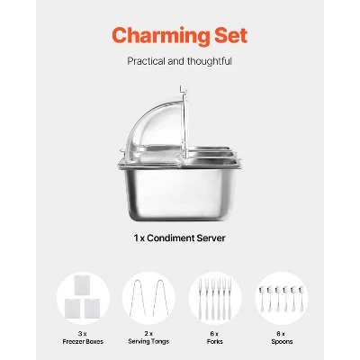Elegant & Practical Set: Our buffet condiment dispenser display rack includes 3 freezer boxes, 2 stainless steel tongs, 6 304 stainless steel fruit forks, 6 304 stainless steel spoons, and 5 silicone mats. It provides practicality and elegance, making dining experiences more convenient and stylish.
