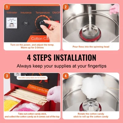 Easy-Operating Process: Using this machine couldn’t be easier. Turn on the power, adjust the temperature, warm up for 2-3 minutes, and pour sugar into the spinning head, and then you just need to use the sticks to collect the cotton candies from the head.