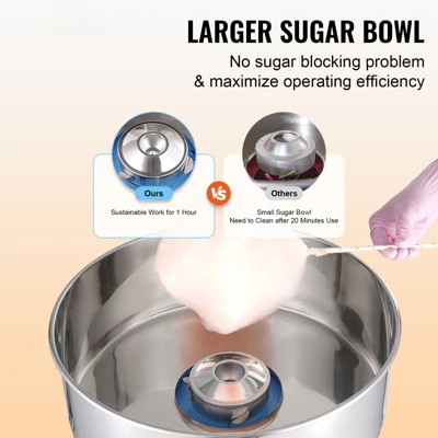 Work with Any Candy You Like: This cotton machine allows you to use the traditional flossing sugars, milk sugars, fruit cubes, or any of your favorite hard candies to make delicious cotton candies. With a compact size, it is suitable for countertop use, and it is perfect for carnivals, festivals, birthday parties, and sports events.