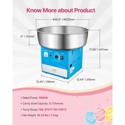 Work with Any Candy You Like: This cotton machine allows you to use the traditional flossing sugars, milk sugars, fruit cubes, or any of your favorite hard candies to make delicious cotton candies. With a compact size, it is suitable for countertop use, and it is perfect for carnivals, festivals, birthday parties, and sports events