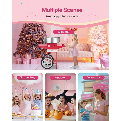 Work with Any Candy You Like: This cotton machine with cart allows you to use the traditional flossing sugars, milk sugars, fruit cubes, or any of your favorite hard candies to make delicious cotton candies. Large wheels and sturdy handle facilitate movement, and it is perfect for carnivals, festivals, birthday parties, and sports events