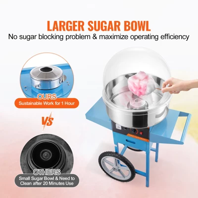 Work with Any Candy You Like: This cotton machine allows you to use the traditional flossing sugars, milk sugars, fruit cubes, or any of your favorite hard candies to make delicious cotton candies. Large wheels and sturdy handle facilitate movement, and it is perfect for carnivals, festivals, birthday parties, and sports events.