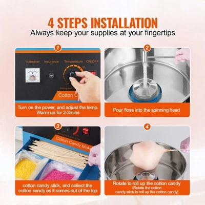 Easy-Operating Process: Using this machine couldn’t be easier. Turn on the power, adjust the temperature, warm up for 2-3 minutes, and pour sugar into the spinning head, and then you just need to use the sticks to collect the cotton candies from the head.