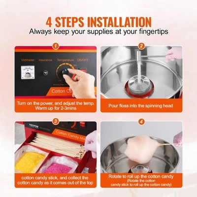 Easy-Operating Process: Using this machine couldn’t be easier. Turn on the power, adjust the temperature, warm up for 2-3 minutes, and pour sugar into the spinning head, and then you just need to use the sticks to collect the cotton candies from the head.