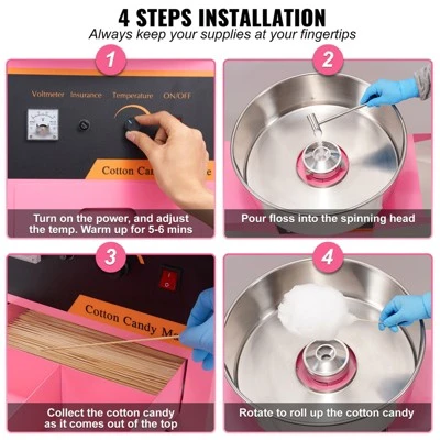 Temp Control: Unlike the common ones, our electric candy floss maker features a voltage meter and a temp control knob. By changing voltage, you can simply adjust the temperature from 149℉ to 473℉. If you want to try different flavored sugars, you will absolutely need this.Easy-Operating Process: Using this machine couldn’t be easier. Turn on the power, adjust the temperature, warm up for 5-6 minutes, and pour sugar into the spinning head, and then you just need to use the sticks to collect the cotton candies from the head.