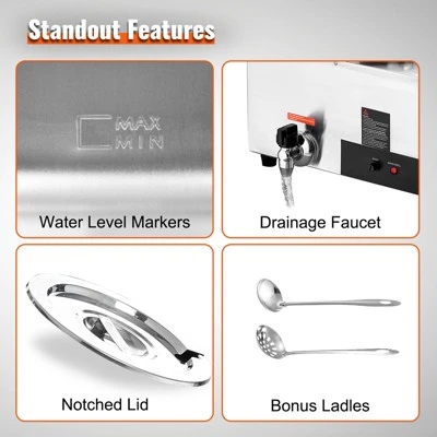 Includes two 7.4Qt Soup Pots: Our commercial soup warmer comes equipped with two 7.4Qt round pots with their respective lids, allowing you to serve different dishes simultaneously. Feel free to change up your menu from soups and sauces to stew, or even nacho cheese and chocolate.