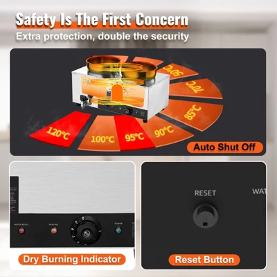 Additional Security: We have upgraded our food warmer with newly designed “Dry Burning Indicator” and “Reset Button”. The dry-burning indicator function automatically stops heating the food when the temperature exceeds 248°F (120°C). To resume operations, simply refill the water and press the Reset Button.