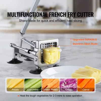 Durable Blades: Our french fry cutter utilizes upgraded food-grade 420J2 stainless steel blades in 1/2 inch and 3/8 inch sizes, enabling effortless cutting of vegetables like potatoes, carrots, cucumbers, and even tougher vegetables like sweet potatoes.