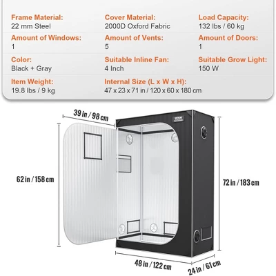 Embark on a journey of lush, thriving indoor plants with the VEVOR Grow Tent. Designed to create the perfect environment for your greenery, this high-performance tent offers unparalleled features that will elevate your indoor growing experience.Crafted with premium 2000D Oxford fabric, this grow tent boasts exceptional light-blocking capabilities, ensuring your plants receive the optimal lighting conditions for robust growth. The inner layer is lined with 100 percent reflective diamond Mylar, maximizing the efficiency of your grow lights and creating a cozy, nurturing atmosphere for your plants to flourish.The sturdy steel frame provides a stable structure that can support up to 132 pounds, allowing you to customize your setup with ease. The tool-free assembly process takes just 10 minutes, saving you valuable time and effort, so you can start growing your indoor garden right away.Thoughtful design elements, such as the observation window and detachable floor tray, make monitoring and maintaining your plants a breeze. The premium SBS zipper ensures smooth, durable operation, even after repeated use, while the extra-thick seam strips block out any unwanted light, creating a truly lightproof environment.Whether you’re an experienced indoor gardener or just starting your green thumb journey, the VEVOR Grow Tent is the perfect companion. Suitable for a wide range of applications, from hydroponics to soil-based growing, this versatile tent can be used in garages, balconies, and even within the comfort of your own home.