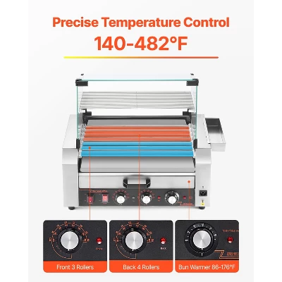 Precise Temperature Control: This roller grill can adjust the cooking temperature up to 482°F separately for front and back rollers. The left knob controls the front 3 rollers, and the right knob controls the back 4 rollers. Additionally, another knob can warm the bun.