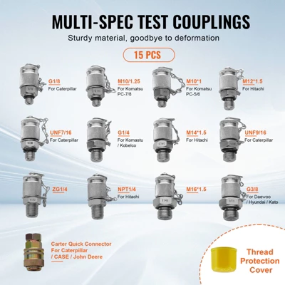 13 Test Couplings with Plastic Protection: With 13 test couplings, including ZG1/4, G1/4, G1/8, G3/8, UNF7/16, UNF9/16, M10/1.25, M14*1.5, M10*1, M16*1.5, M12*1.5, NPT1/4, carter quick connector and 14 tee connector. This excavator pressure gauge kit can be used with various excavator models. The thread joints feature a protective plastic film to prevent damage and ensure secure connections.