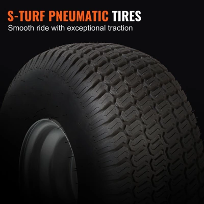 Pneumatic Tires: Double the reliability, Double the comfort. Our lawn mover tires are made from premium rubber with a max pressure of 22psi and patterned tread for superior grip and shock absorption, ensuring stability and a smoother ride.