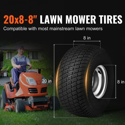Lawn Mover Tires Size: Tire diameter:20″; Tire width: 8″; Rim diameter: 8″. Our lawn mower tires are crafted to fit most lawn mowers and lawn tractor models, ensuring a perfect match.