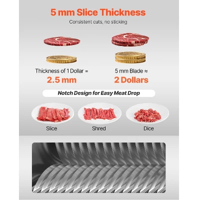 Effortless 5 mm Cuts: Equipped with sharp Ф86 mm blades, our commercial meat slicer blade set delivers 5 mm thick slices. Moreover, the notch design allows meat to drop off effortlessly, making it great for boneless meats and soft vegetables. Whether slicing, shredding, or dicing, this slicer gets the job done fast.