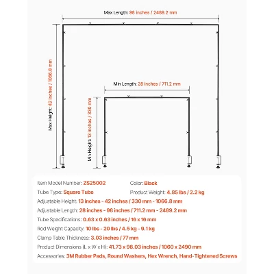 Sturdy Weight-Bearing Design: Built with square metal tubes and 3.03 in / 77 mm C-clamps, this over the table rod stand offers 10-20 lbs (4.5 kg – 9.1 kg) load capacity, making it more durable and stable than ordinary thin round pipes. The rust-resistant powder-coated surface withstands outdoor weather.