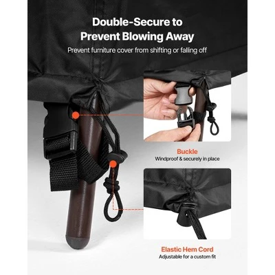 Windproof Design: Equipped with buckles and elastic hem cords, this outdoor dining table cover is securely fastened to your furniture to prevent shifting or blowing away, even in strong winds, providing reliable protection in all conditions.