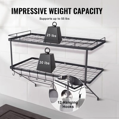 Strong Loading Capacity: Crafted with high-strength carbon steel, our pots and pans hanging rack is carefully designed and reinforced to withstand heavy loads, supporting up to 55 lbs. Hang your pots securely and cook with peace of mind.