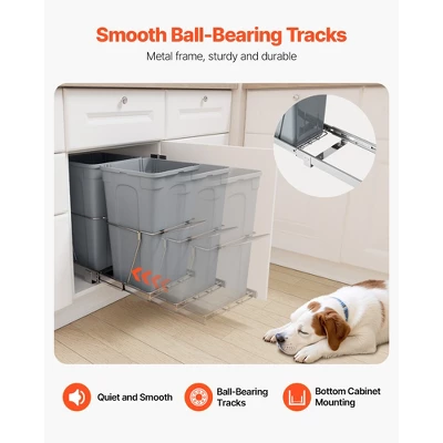 Dual 27QT Capacity: Our pull out garbage can comes with a 27 + 27QT large capacity, perfectly meeting the needs of both home and commercial use. It helps eliminate the hassle of frequent trash disposal. The dual-bin design also aids in waste sorting. With bottom installation, it can hold up to 25 kg / 55.12 lbs of trash and slides in and out effortlessly