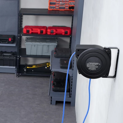 Versatile and User-Friendly: Perfect for ceiling or wall mounting, our retractable cord reel lets you easily pull and retract the cord from any direction, freeing up valuable space. Say goodbye to tangled cables and tripping hazards—our extension cord reel keeps everything neatly stored and within reach, making your setup cleaner and more efficient.